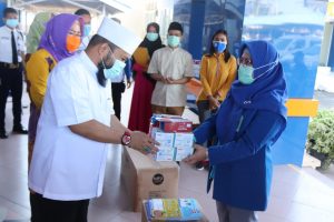 Usai membuka acara pelatihan, Helmi menyerahkan bantuan APD dan masker berikut vitamin kepada RS Tiaara Sella dan RSHD yang diterima oleh pihak perwakilan dari masing-masing rumah sakit di RSHD.