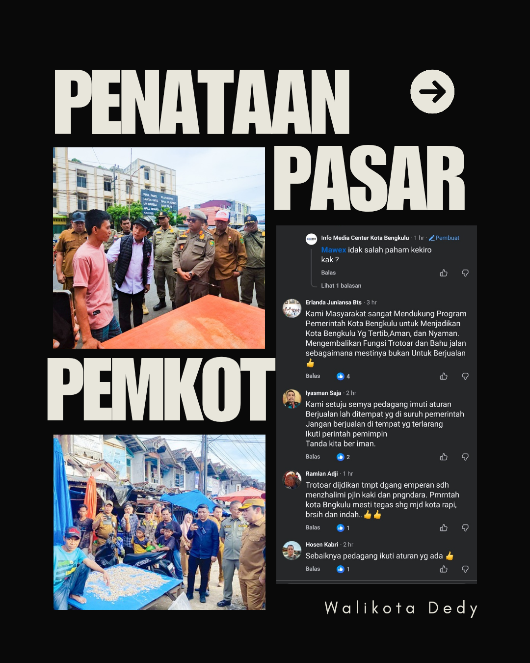 Melalui media sosial resmi pemerintah kota, warga menyuarakan dukungan penuh kepada Walikota Bengkulu Dedy Wahyudi dan Wakil Walikota Ronny PL Tobing untuk menertibkan kawasan publik yang kerap disalahgunakan.