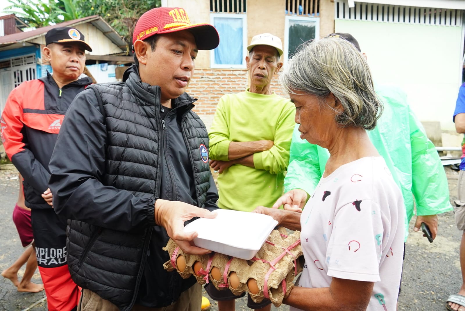 Pada kesempatan itu Dedy juga menyerahkan bantuan kepada warga sekitar yang terkena banjir.