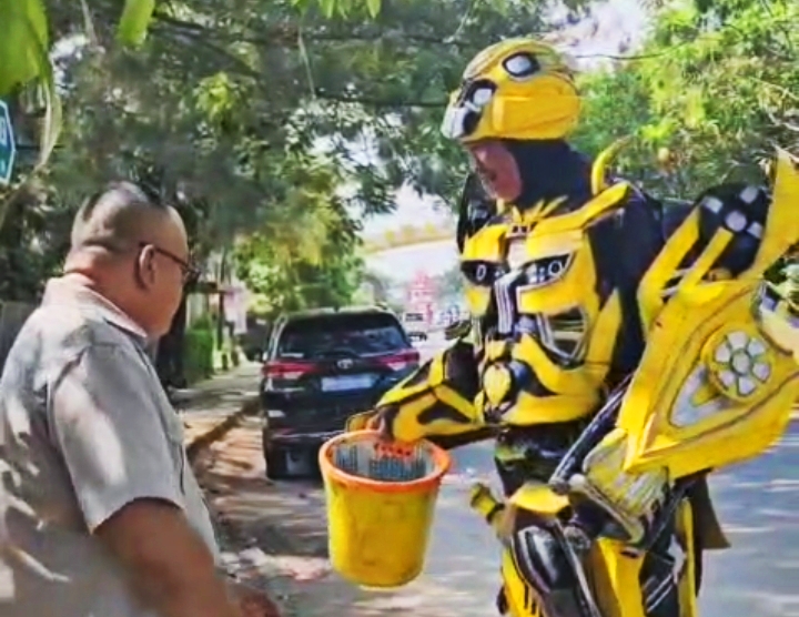 Bengkulu,InfoPublik – Dengan menggunakan kostum robot, seorang pengemis asal Kota Palembang Provinsi Sumsel meminta uang kepada setiap kepada pengendara yang melintas di jalan, persisnya di depan pintu keluar loket pembayaran parkir Bencoolen Mall.