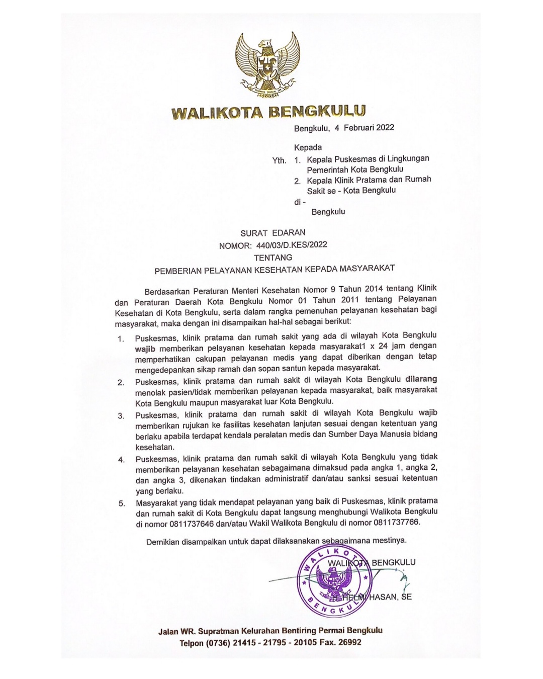 5. Masyarakat yang tidak mendapat pelayanan yang baik di Puskesmas, klinik pratama dan rumah sakit di Kota Bengkulu dapat langsung menghubungi Walikota Bengkulu di nomor 0811737646 atau Wakil Walikota Bengkulu di nomor 0811737766. (**)