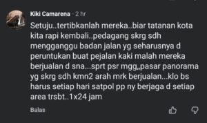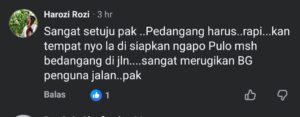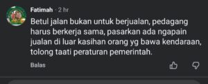 Senada dengan Kiki, akun atas nama Harozi Rozi juga menyatakan persetujuannya. Ia menyoroti minimnya kesadaran pedagang untuk berjualan di lokasi yang telah disediakan.