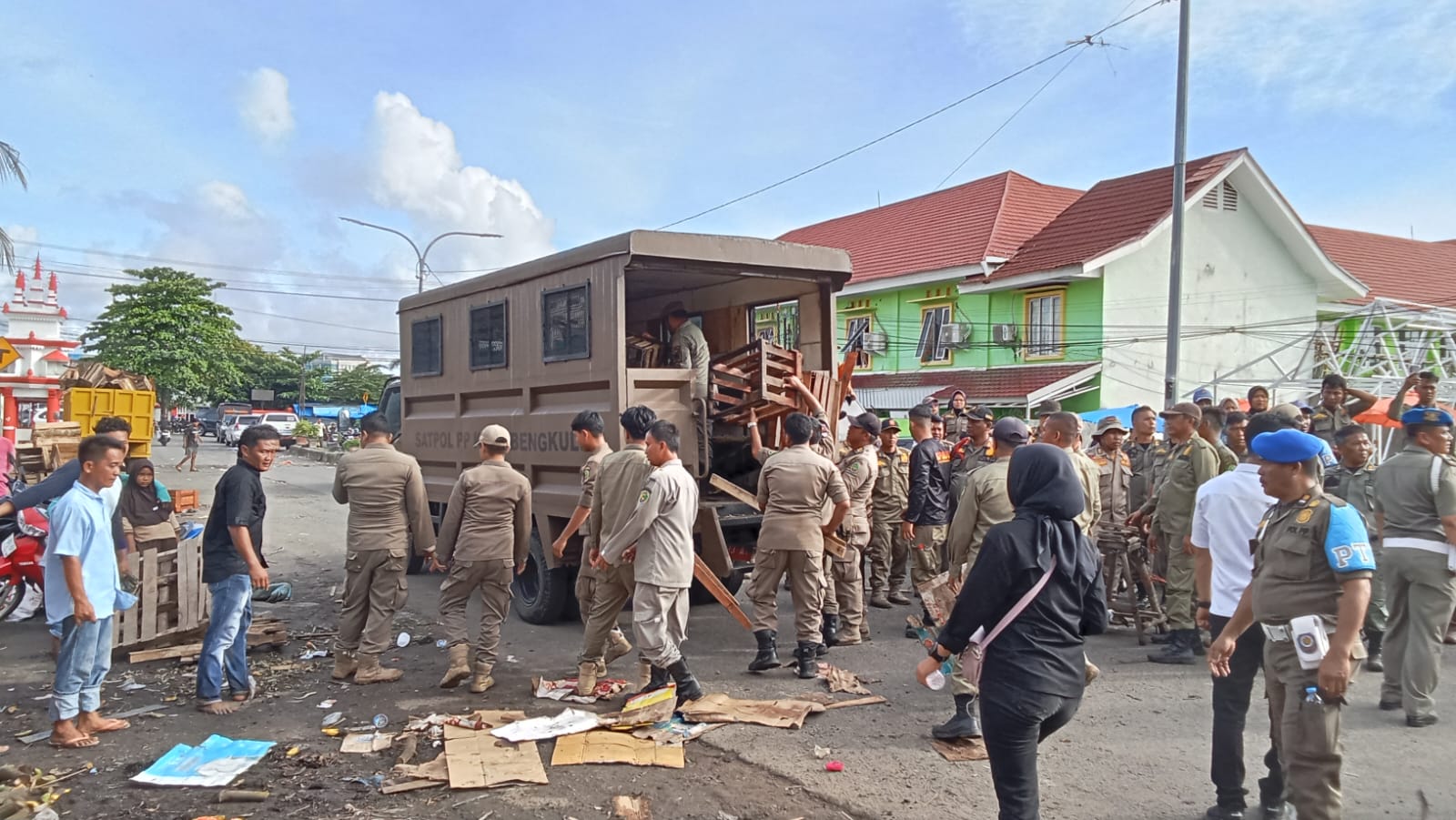 Dengan Diback Up anggota Polresta Bengkulu dan TNI baik yang berseragam maupun yang berpakaian preman, personel Satpol PP dibawah komando Sahat Marulitua Situmorang selaku Kasat Pol PP langsung gerak cepat (gercep).