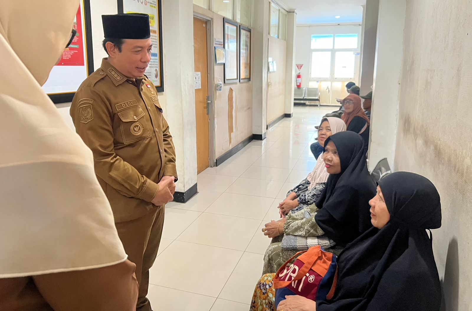 Dalam kesempatan tersebut, Dedy tidak hanya menyapa, tetapi juga mempraktikkan secara langsung cara berinteraksi dengan pasien secara ramah. Ia berdialog ringan, menanyakan kondisi kesehatan pasien, serta memberikan motivasi kepada pasien dan keluarga yang tengah menunggu pelayanan.