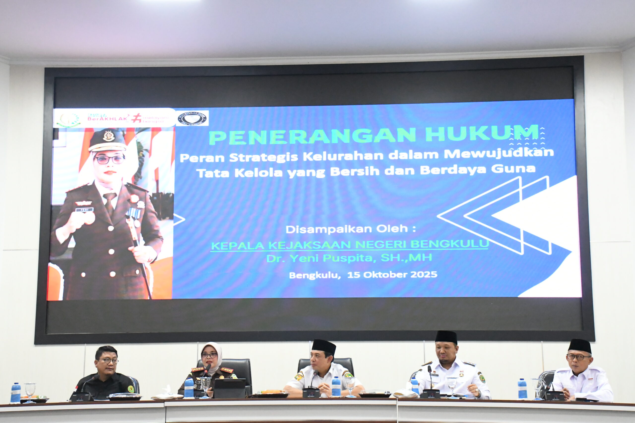 Penerangan Hukum berlangsung di Ruang Hidayah 1, kantor Walikota, Rabu (15/10/25), dengan mengundang lurah dan operator kelurahan se-Kota Bengkulu dengan tema “Peran Strategis Kelurahan dalam Mewujudkan Tata Kelola yang Bersih dan Berdaya Guna”.
