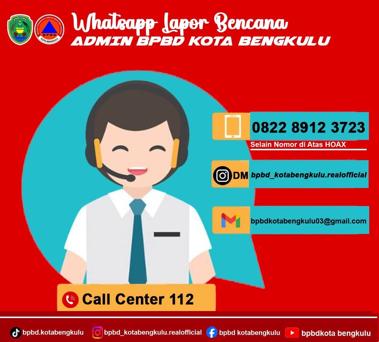 Apabila terjadi bencana dan keadaan darurat di Kota Bengkulu silahkan hubungi admin BPBD Kota Bengkulu (0822-8912-3723) atau bisa menghubungi Call Center 112 Kota Bengkulu. (**)