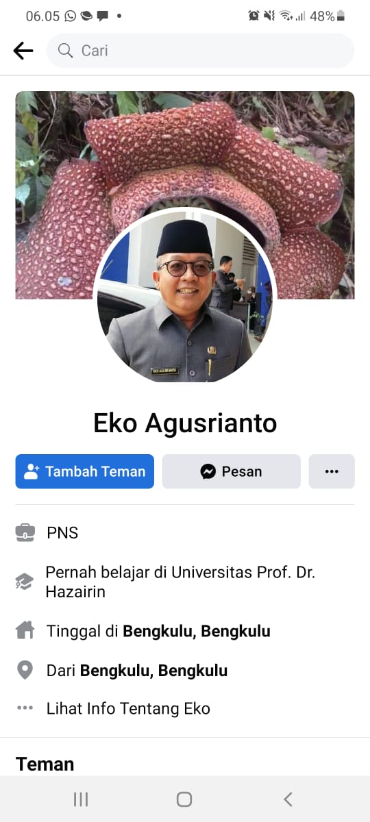 Bengkulu, InfoPublik – Kepala Dinas Komunikasi, Informatika dan Persandian (Diskominfosan) Kota Bengkulu Eko Agusrianto angkat bicara dan memastikan akun Facebook (FB) atas nama “Eko Agusrianto” bukanlah dirinya, melainkan ada oknum yang sengaja mempalsukan atau mengkloningnya.