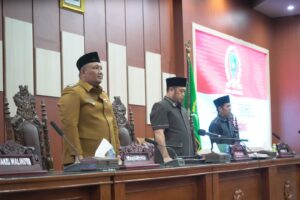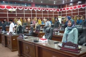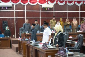 Ketua DPRD Kota Bengkulu Herimanto didampingi Wakil Ketua I Rahmat Widodo memimpin langsung rapat paripurna yang digelar di ruang ratu agung dengan agenda jawaban Walikota Bengkulu terhadap pandangan umum fraksi – fraksi, Selasa sore (23/9).